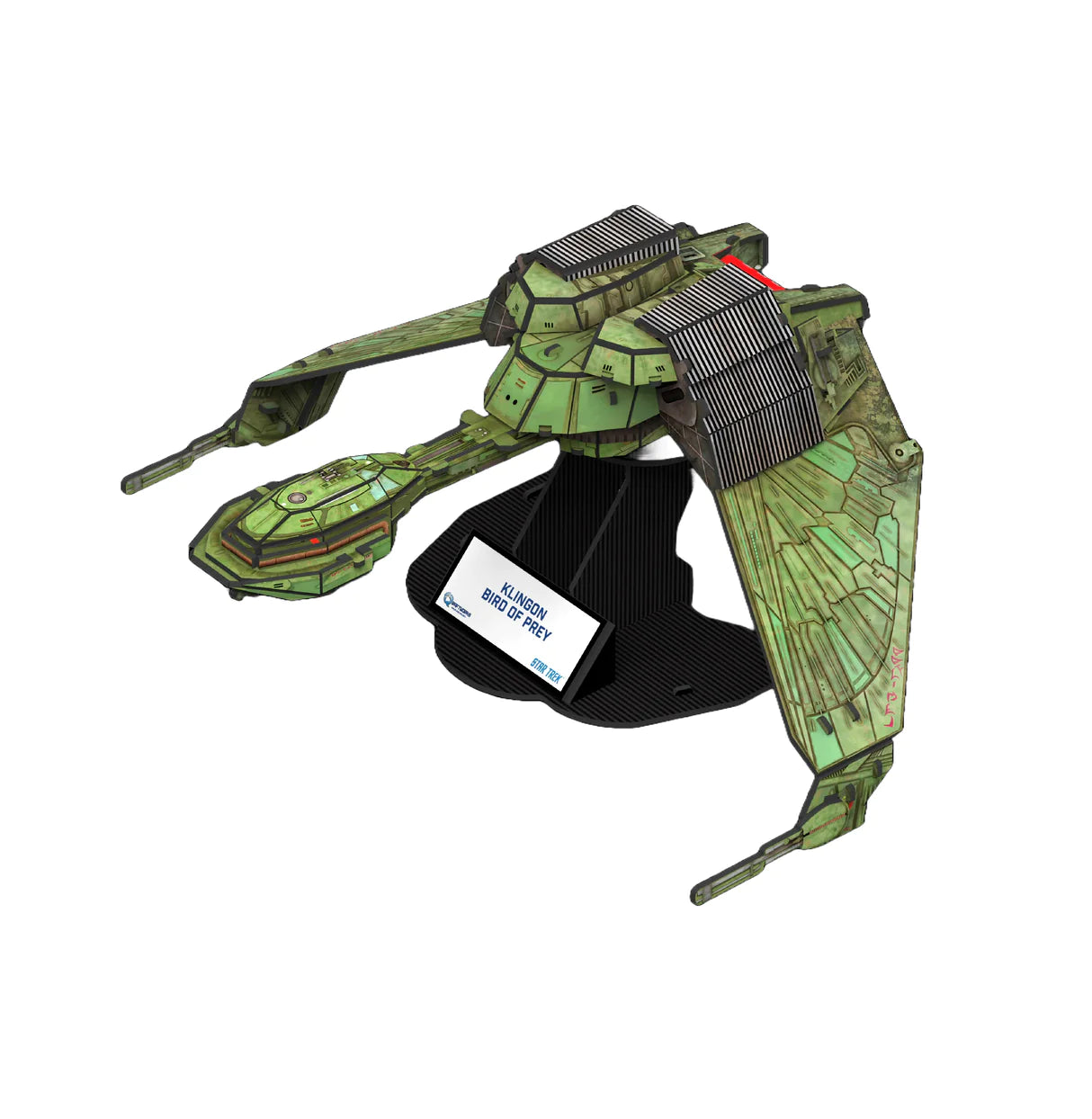 Developed using 3D models of Star Trek: Original Series starships, the Klingon Bird of Prey model kit consists of 65 parts that form a beautiful replica measuring exactly 11 inches long. The Klingon Bird of Prey also comes with a stand and dedication plaque, ready for display.
