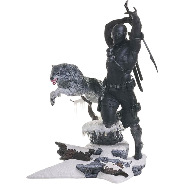 G.I. Joe's silent ninja, Snake Eyes, leaps from a snowy ledge in this plastic statue diorama! Flanked by his wolf companion Timber, Snake Eyes wields his trademark sword as he launches his sneak attack.