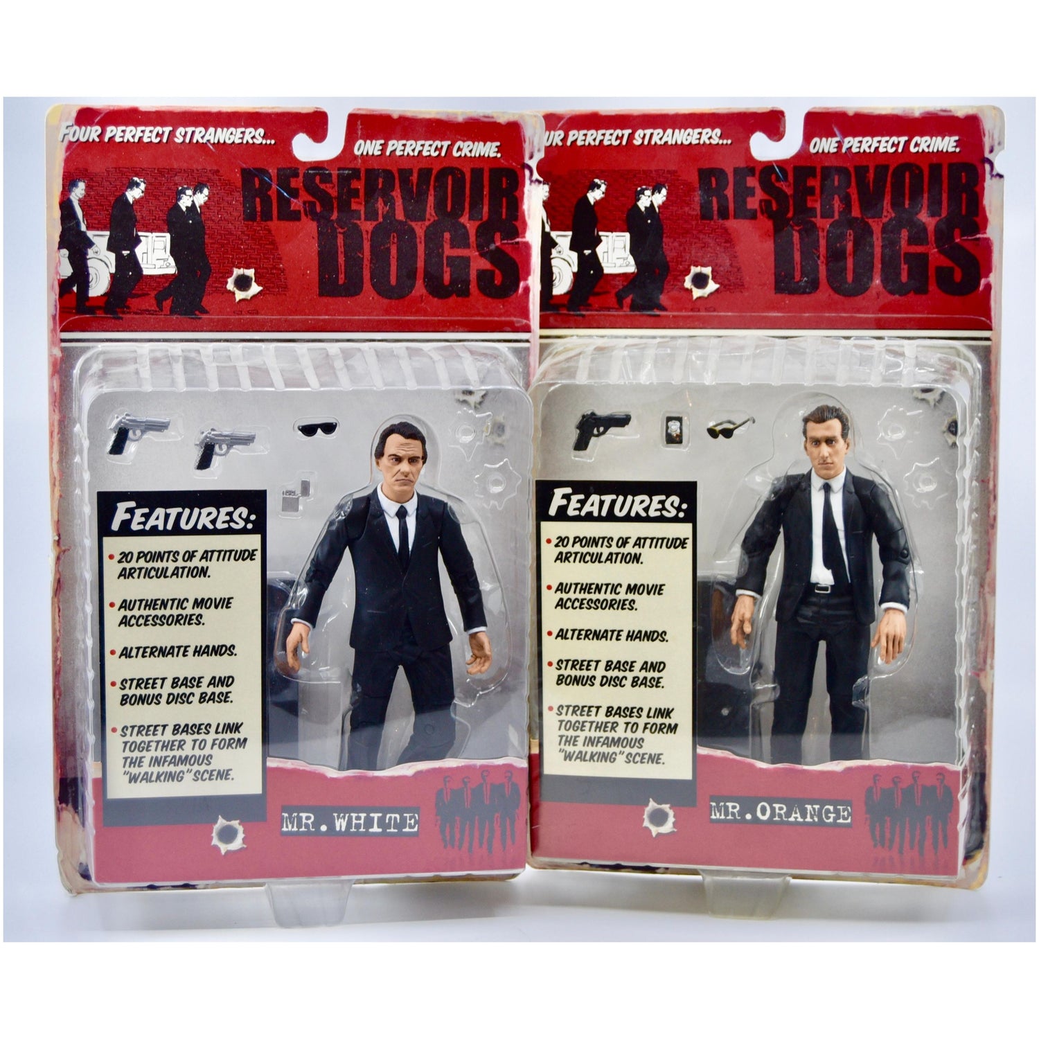 Each figure features: 20 points of articulation, Authentic movie accessories, alternate hands, street base and bonus disc base. Street bases link together to form the infamous walking scene. All four of these action figures are new on card.