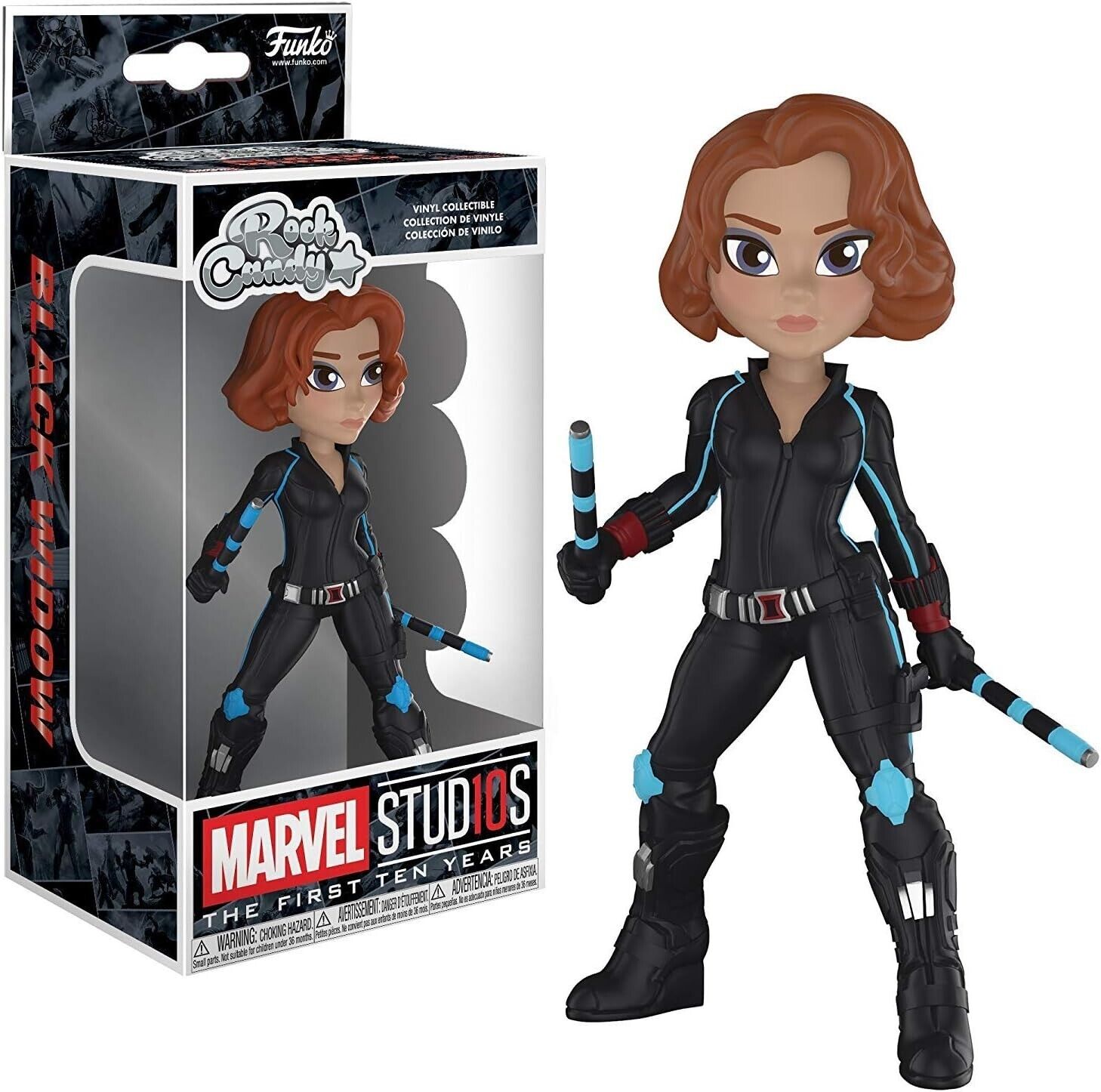 For Marvel Studios' 10th anniversary 10, Black Widow, as a stylized Rock Candy vinyl, stands 5' talland comes in a window display box.
